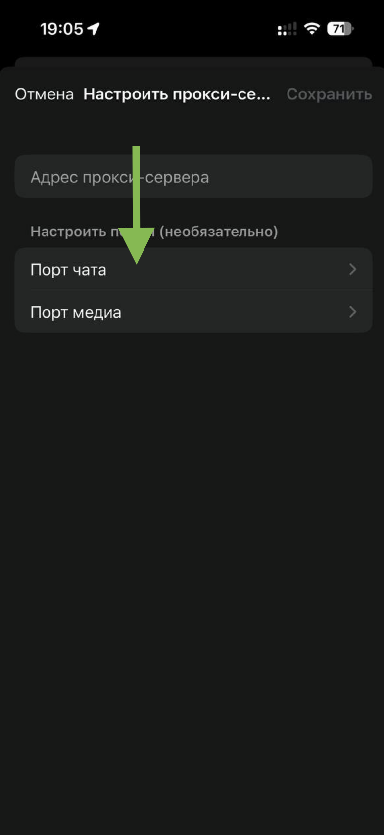 Перейдите в раздел «Порт чата». Введите порт 443 и включите «Использовать TLS»